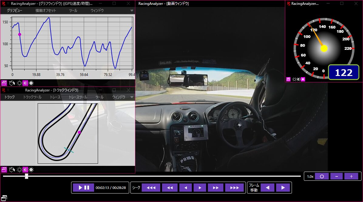 Racing Analyzer は、グラフ表示や走行軌跡表示、車載動画連携などの様々な解析機能を搭載!