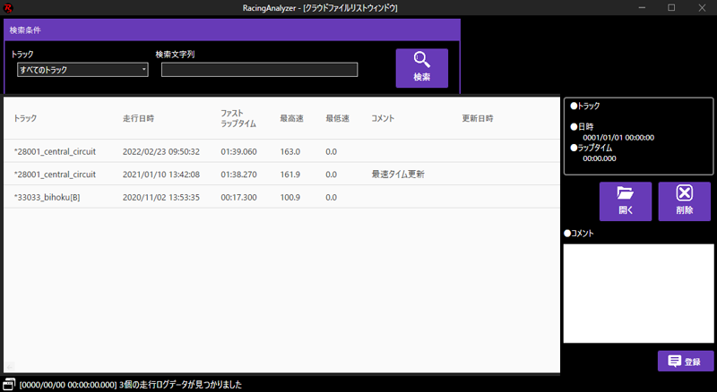 アップロードされた走行ログファイルは、クラウドサーバー上でログインユーザごとに管理されており、自由に検索やダウンロードを行うことができます😊